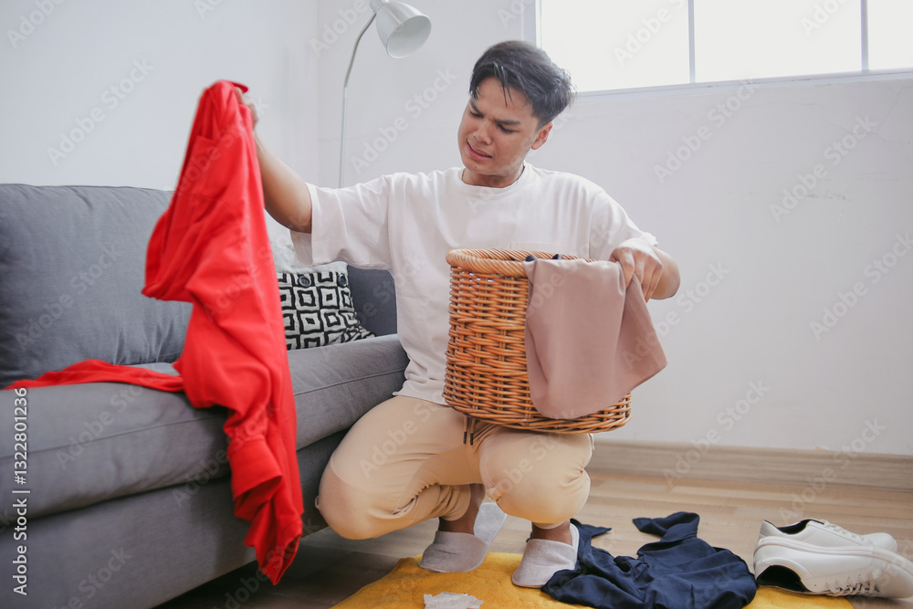 Young Man Feeling Sad To Take Dirty Clothes And Put On Laundry Basket At Messy Room