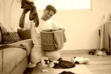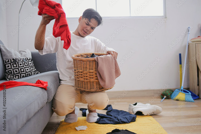 Young Man Feel Disgusted Putting Dirty Clothes Into Laundry Basket