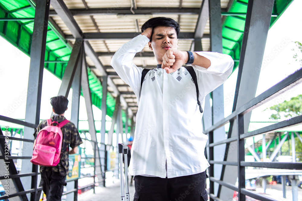 Worry Muslim Man Looking at Wristwatch and Touching Head, Late For His Flight To Hometown During Eid