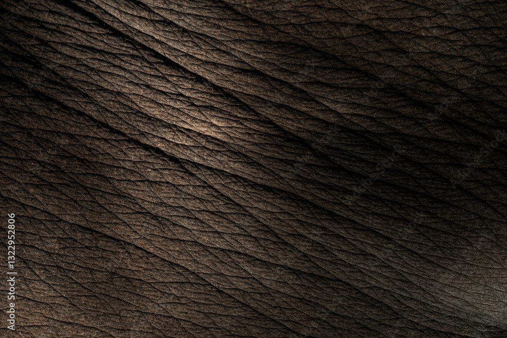 The background pattern of the elephant skin is dark black. The pattern on the elephant skin with the skin and hair of the elephant is sharp and detailed.