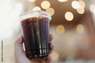Someone hand holding a cup of iced Americano with bokhe background