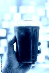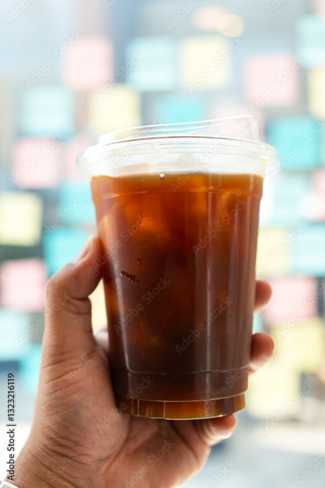 Hand holding iced black coffee or americano coffee in plastic cup with many post it notes in the office