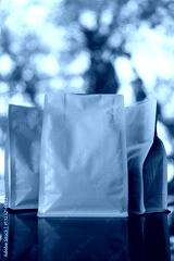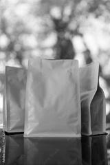 White roasted coffee beans bag standing, front view. Premium bag zip package