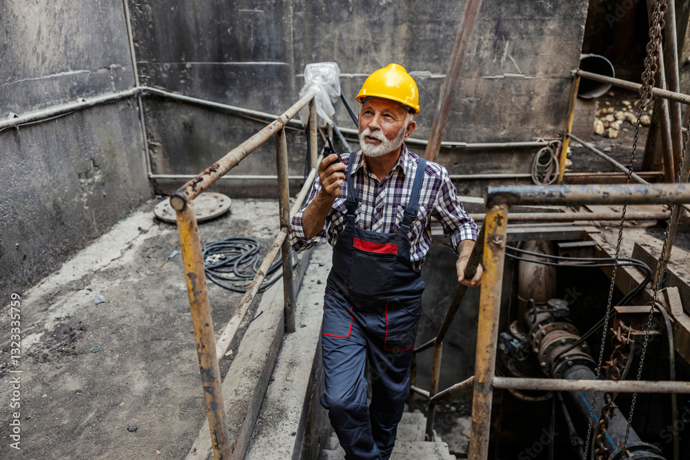 Portrait of senior industry worker climbing stairs in facility and talking on walkie talkie.