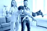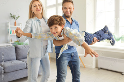 Happy young family of three having fun and playing plane with child in living room at home. Mother, father and their little cute son spending time together enjoying weekend indoors.