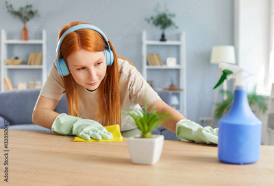 Young millennial red-haired girl woman wearing headphones, gloves cleaning wooden table surface, housekeeping service worker, female housewife doing chores daily routine at home, removing dirt, wiping