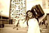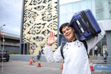 Young Asian Muslim Man Carrying Suitcase On Shoulder While Greeting By Waving Hand. Mudik During Eid Mubarak Concept.