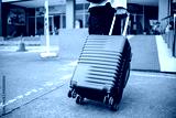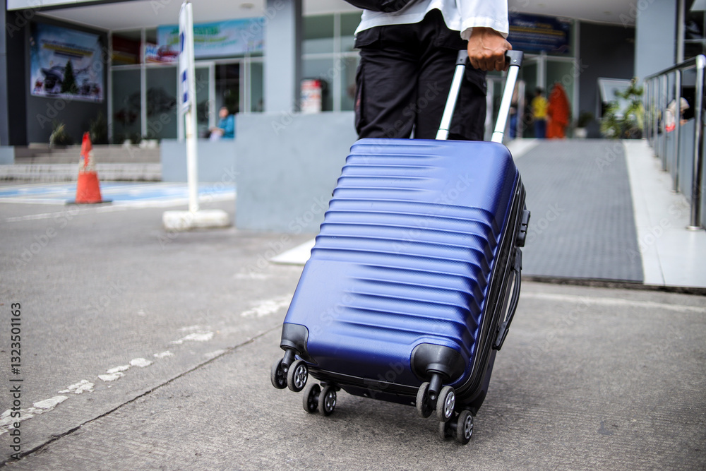 Tourist Man Pulling Suitcase and Walking on The Street. Travel and Vacation Concept.