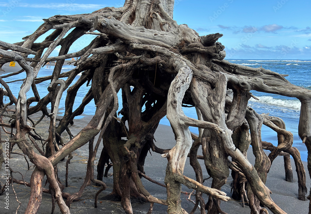 Racines d’arbres déracinés sur la plage de l’Etang-Salé, île de la Réunion
