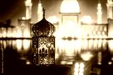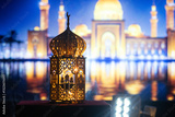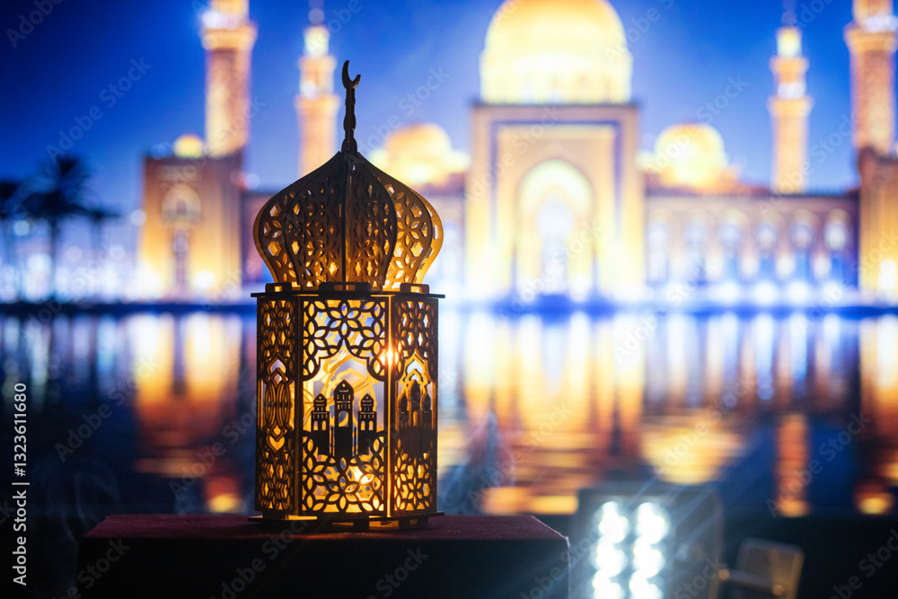 ornamental Arabic lantern with burning candle glowing at night and mosque in background. Festive greeting card for Muslim holy month Ramadan Kareem.