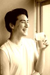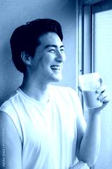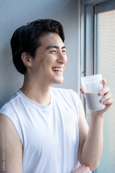 窓際でプロテインを飲む日本人男性