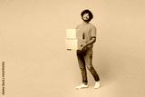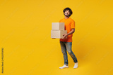 Full body young smiling fun cool happy Indian man he wear orange t-shirt casual clothes hold stack of two blank cardboard boxes isolated on plain yellow background studio portrait. Lifestyle concept.
