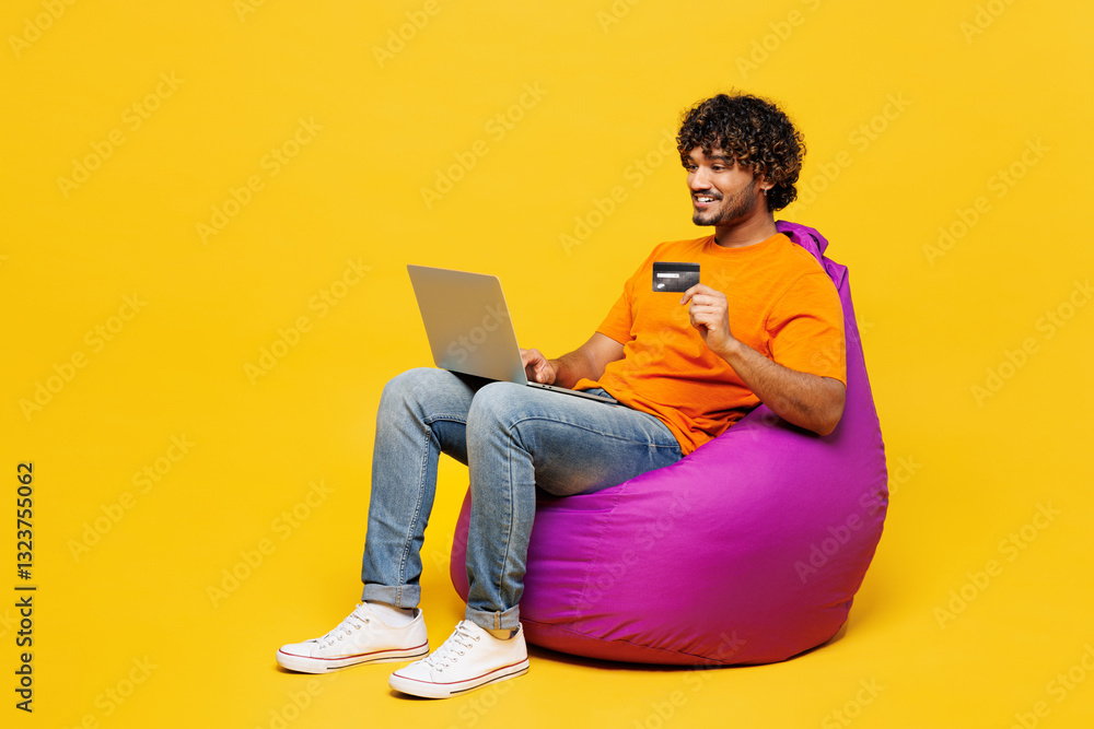 Full body young Indian man he wear orange t-shirt casual clothes sit in bag chair using laptop pc computer hold credit bank card doing online shopping booking tour isolated on plain yellow background.