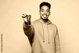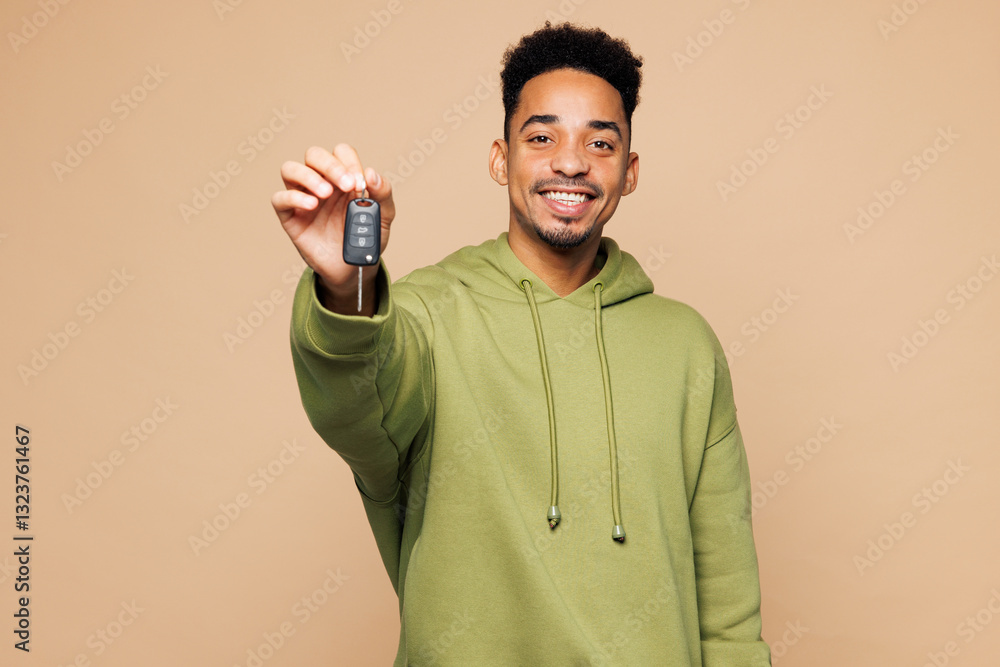Young man of African American ethnicity in green hoodie casual clothes hold car key fob keyless system stretch hand to camera isolated on plain pastel light beige background studio Lifestyle concept