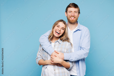 Young smiling couple two friends family man woman wear shirt casual clothes cuddle embrace look camera together isolated on pastel plain light blue cyan background studio portrait. Lifestyle concept.