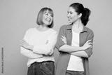 Elder smiling parent mom 50s years old with young adult daughter two women together wear casual clothes hold hands crossed folded isolated on plain pastel light beige background. Family day concept.