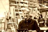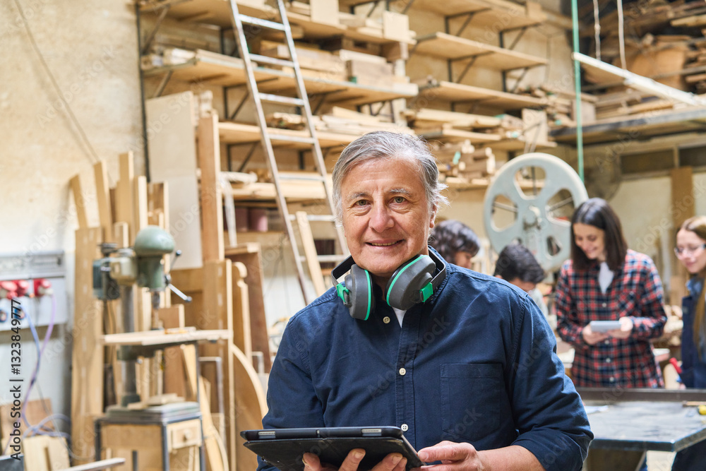 Experienced craftsman guiding young apprentices in a bustling lumberyard