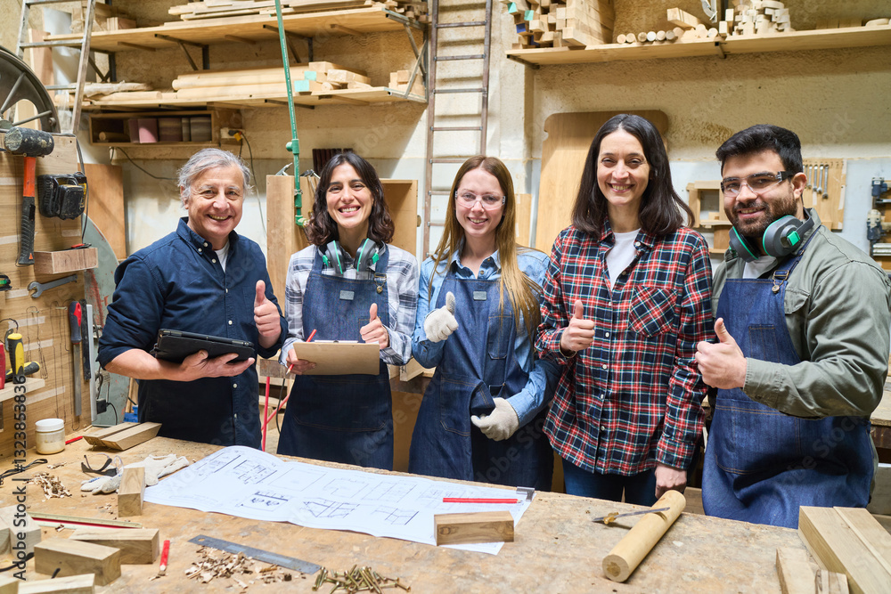 Team of young and experienced workers in a lumberyard workshop