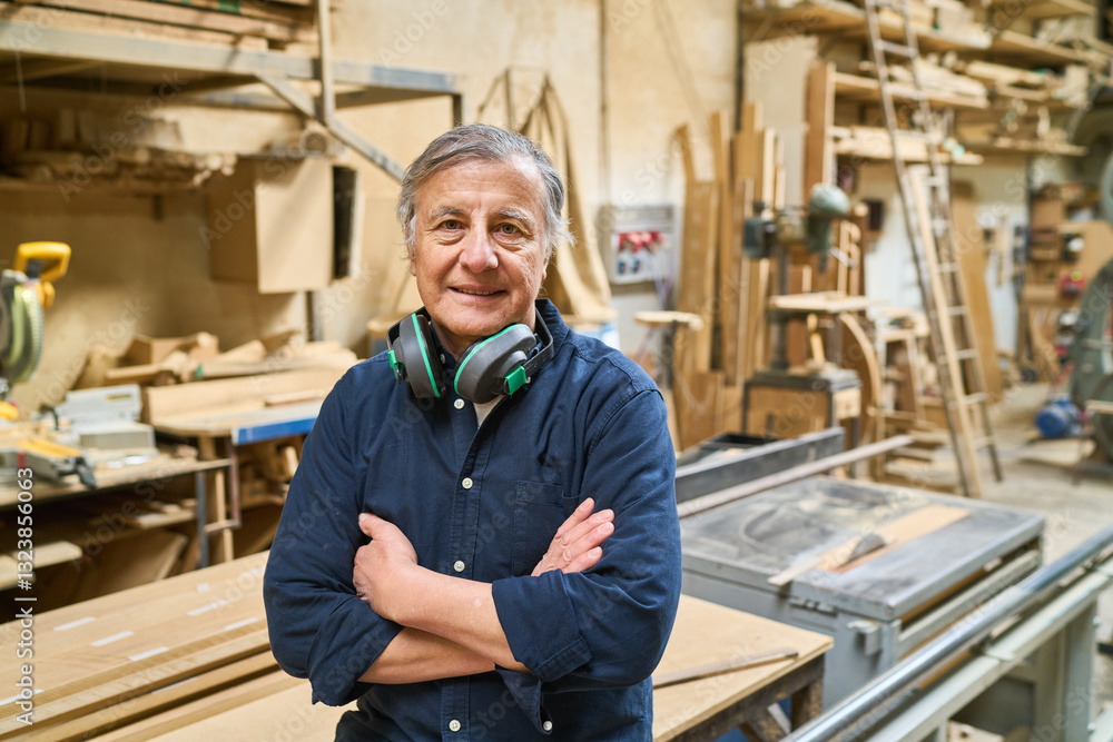Senior craftsman standing in a busy lumberyard workshop setting