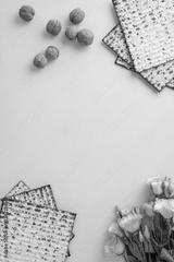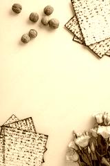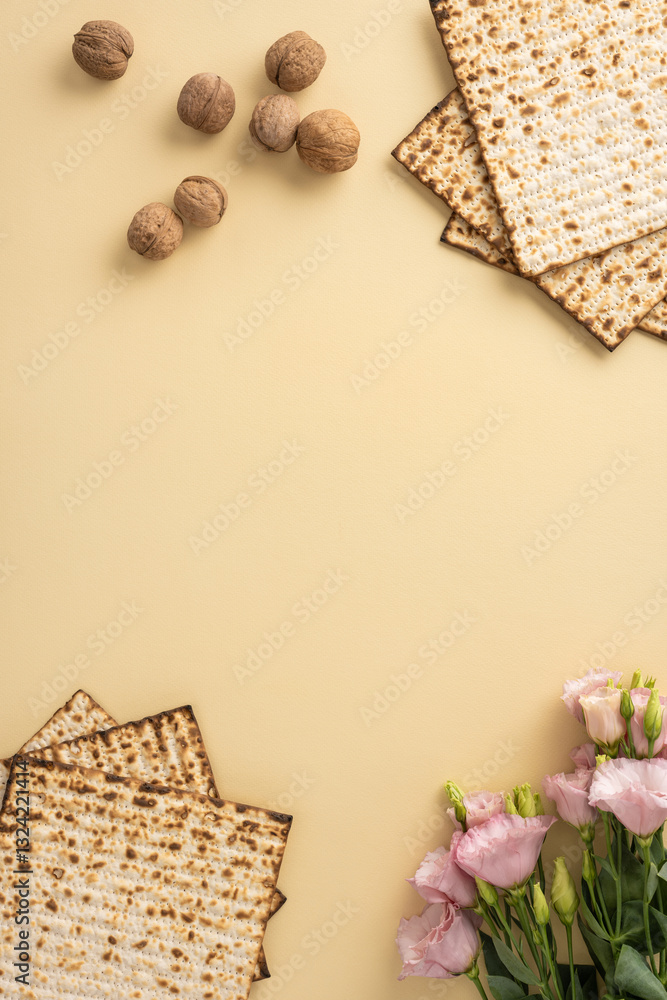 Decorative vertical Passover arrangement featuring matzah bread, scattered walnuts, and delicate pink flowers on a neutral beige background