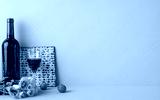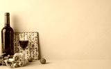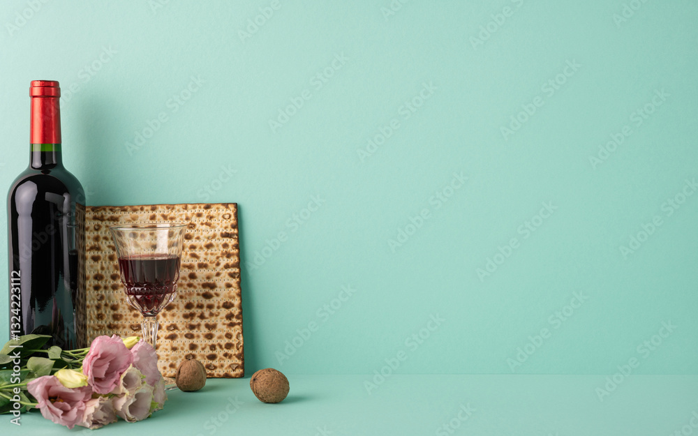 Side view image of Passover items including wine, matzah, and flowers arranged against a green backdrop