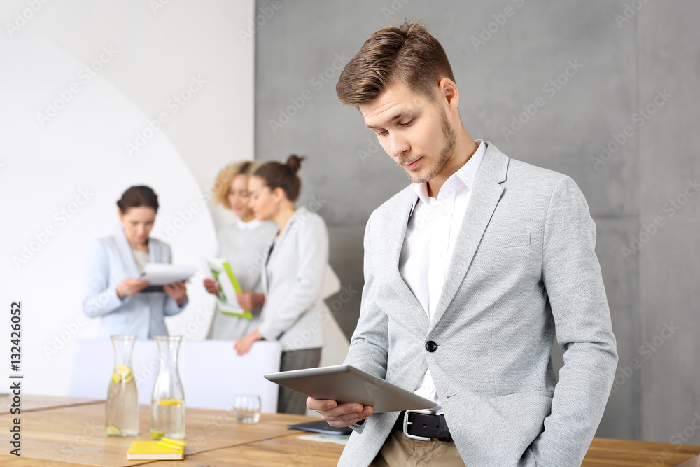 Młody księgowy czyta dokumenty. Zespół pracowników na prezentacji strategii firmy.