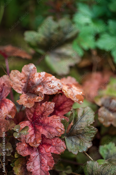 Raindrops adorn vibrant leaves, highlighting nature's beauty in a lively garden