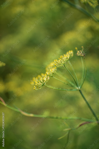 Delicate dill flowers reach skyward, bathed in soft golden light in a serene meadow