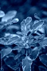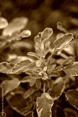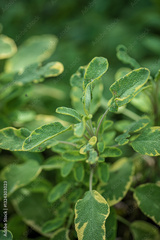 Lush green foliage with distinct yellow edges thrives under sunlight in a tranquil garden