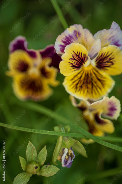 Pansy flowers display intricate patterns, radiating beauty against a lush green backdrop