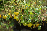 Lush tomato vines bear ripening yellow and green fruit against a sunny green backdrop