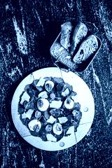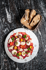 Colorful carpaccio decorated with herbs, cheese, and tomatoes, accompanied by freshly baked bread