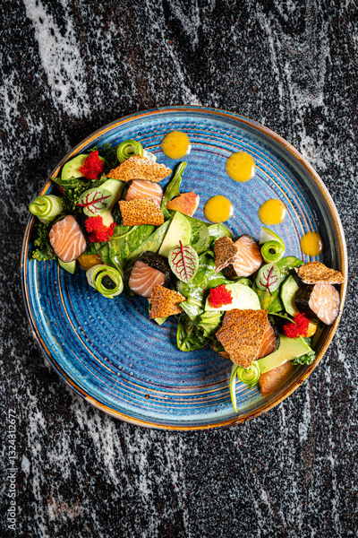 A vibrant salmon salad with fresh greens, colorful toppings, and artistic presentation