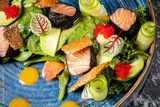 Brightly colored salad combines fresh salmon, greens, and artistic garnishes for a culinary delight