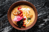 This vibrant bowl contains creamy shrimp soup with fresh veggies and herbs for a delightful dish
