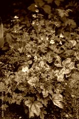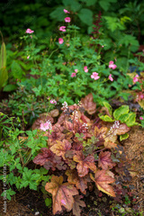 Colorful blooms blend with autumn leaves, creating a serene atmosphere in a lush garden