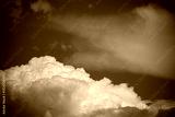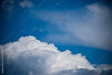 Fluffy white clouds float steadily under a bright blue sky, showcasing serene weather conditions