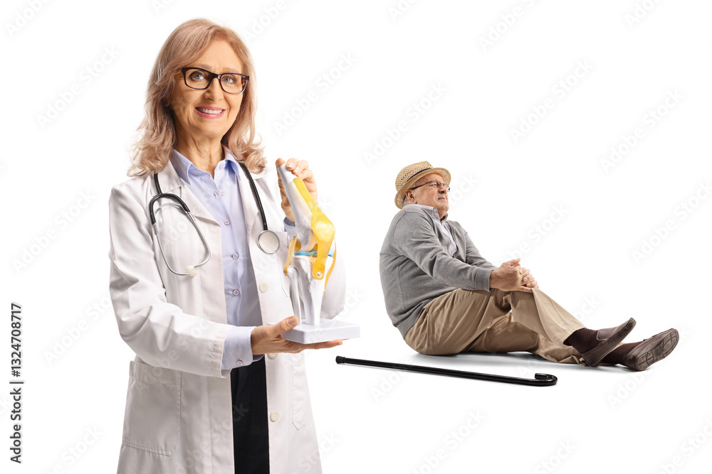 Elderly man with knee pain and female orthopaedic doctor holding a knee bone model