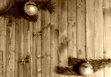Christmas decored branches on nature wood background