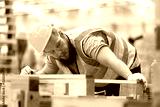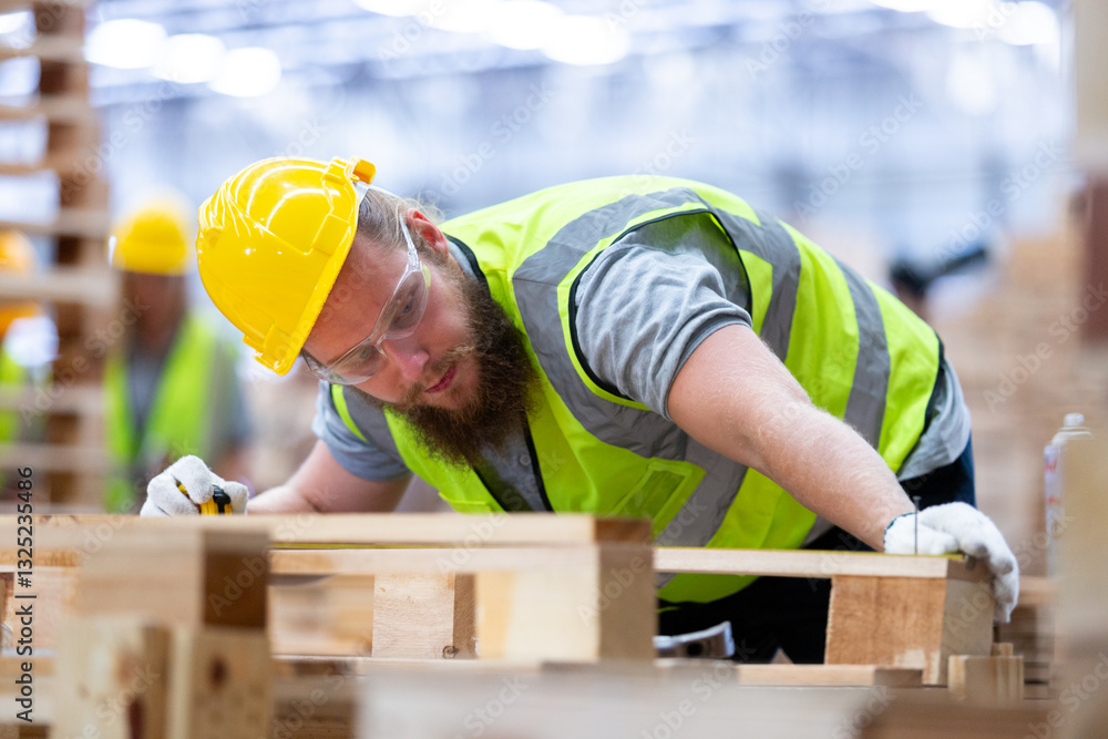 Wood factory construction worker wearing a yellow hard hat and safety vest focuses on measuring and crafting wooden materials in well-lit workshop.