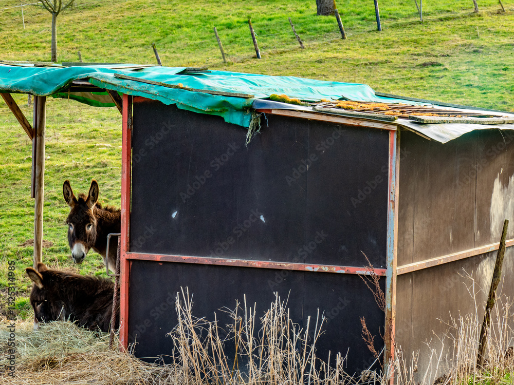 Junge Esel im Stall und auf der Weide