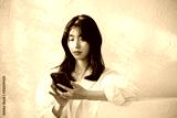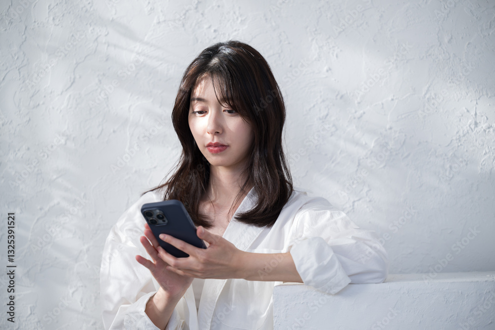 日差しのある白い背景でスマートフォンを使う女性の上半身 検索や調べるで俯く春夏のイメージ