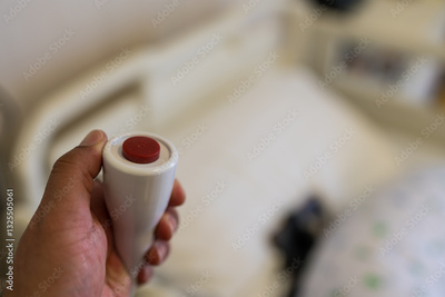 Hand holding nurse call button for emergency bell in hospital ward. Nurse call button.
