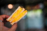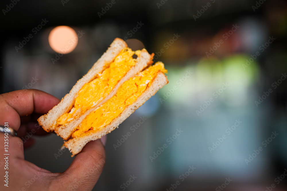 Breakfast sandwich with omelet eggs on hand