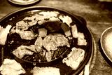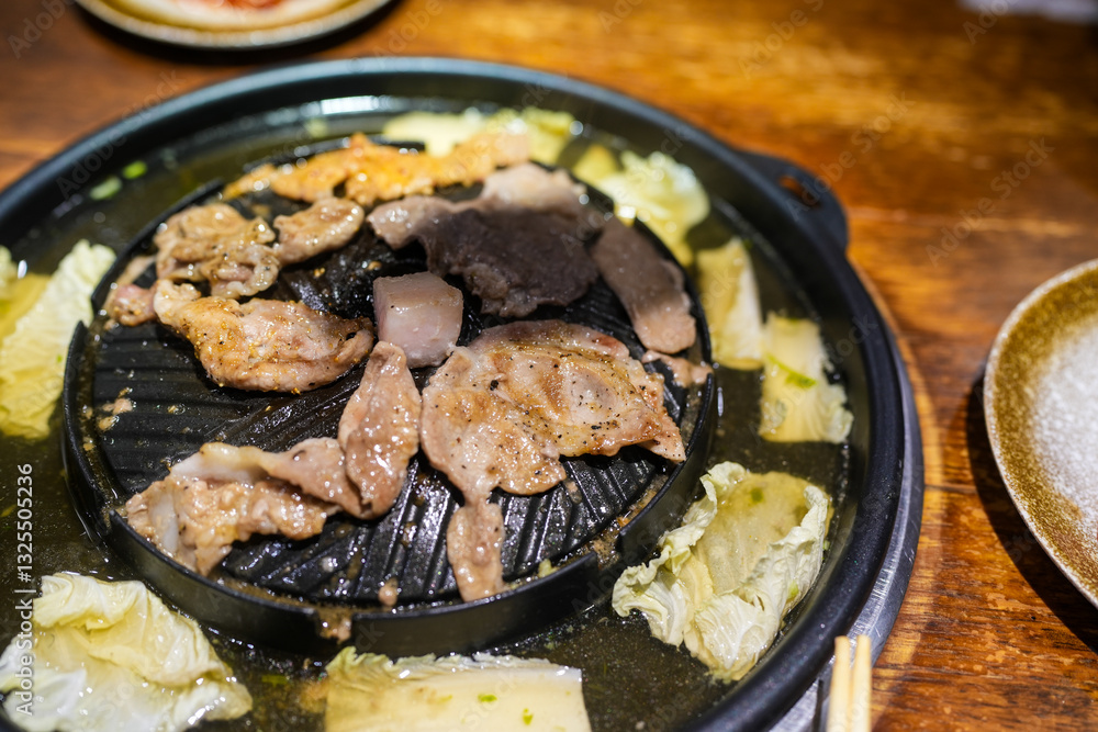 Pork grilling in pan on the electronic stove. Eating Thai style barbecue. Its name is called moo ka ta, a popular food among Thai people on holidays.