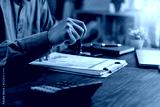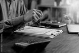 Financial approval and business agreement concept featuring a hand holding a seal stamp on a document. Ideal for management, accounting, and contracts.