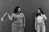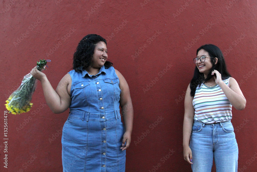 Young Latina sisters and friends, brunettes, give each other yellow flowers to show their love and the arrival of spring