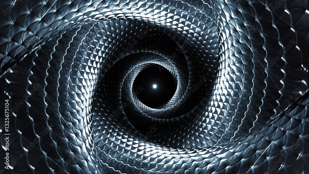 Mesmerizing Spiral Pattern of Metallic Scales Creates Tunnel Effect with Light, Evoking Depth and Motion Through Intricate Design and Reflective Surfaces in Futuristic and Abstract Visual