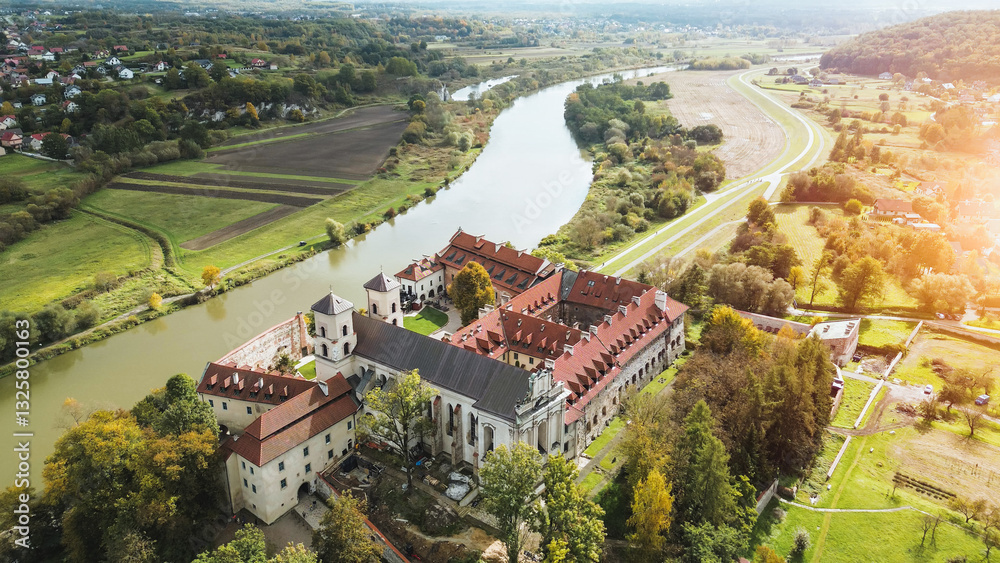 Scenic aerial of Tyniec Abbey and river