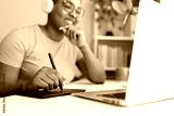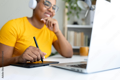 Graphic designer working from home using drawing tablet and laptop